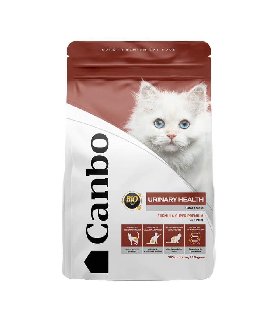 Canbo Super Premium Cuidado del tracto urinario para gatos adultos es un alimento exclusivo que ayuda a mantener un sistema urinario saludable, mediante la acción conjunta de acidificantes estables que regulan el pH de la orina, logrando así disminuir el riesgo de la formación de cálculos de estruvita y oxalato.
